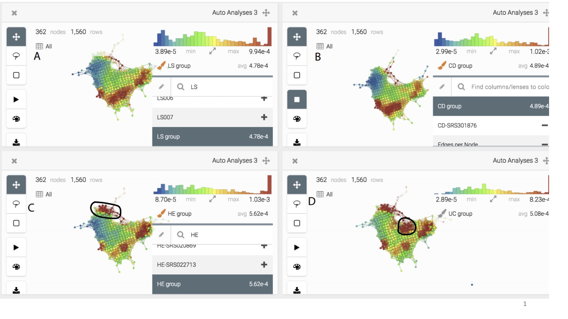 We offer an additional analysis in Figure 4 below, this one coming from a study of the gut biome by the Larry Smarr group at University of California, San Diego. The features consist of abundances of bacterial subpopulations. This is also a wide data set, including thousands of distinct subpopulations. There are four copies of a topological model on the subpopulations, colored by healthy patients (lower left), ulcerative colitis (lower right), and two forms of Crohn's disease (ileal and colitic) above. On the lower right we circle a group of subpopulations which is highly represented in ulcerative colitis and which is not in healthy patients. Similarly, on the lower right, we circle a group which is heavily represented in the healthy patients and not well represented in either of the forms of Crohn's disease. In both cases, we have identified the only regions (collections of subpopulations) in which there appear to be a significant distinction with the healthy patients.