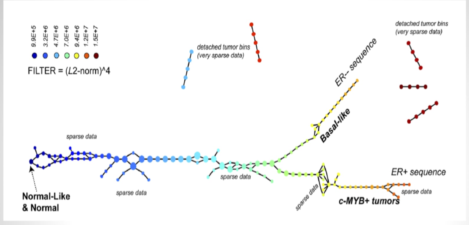 Figure 2 below shows a topological model of the patients in a study of breast cancer from the Netherlands Cancer Institute (NKI). The paper describing the work is here. The features are mRNA expression levels of 1500 genes in each patient, so the data matrix has 1500 columns. There were 272 patients in the study.