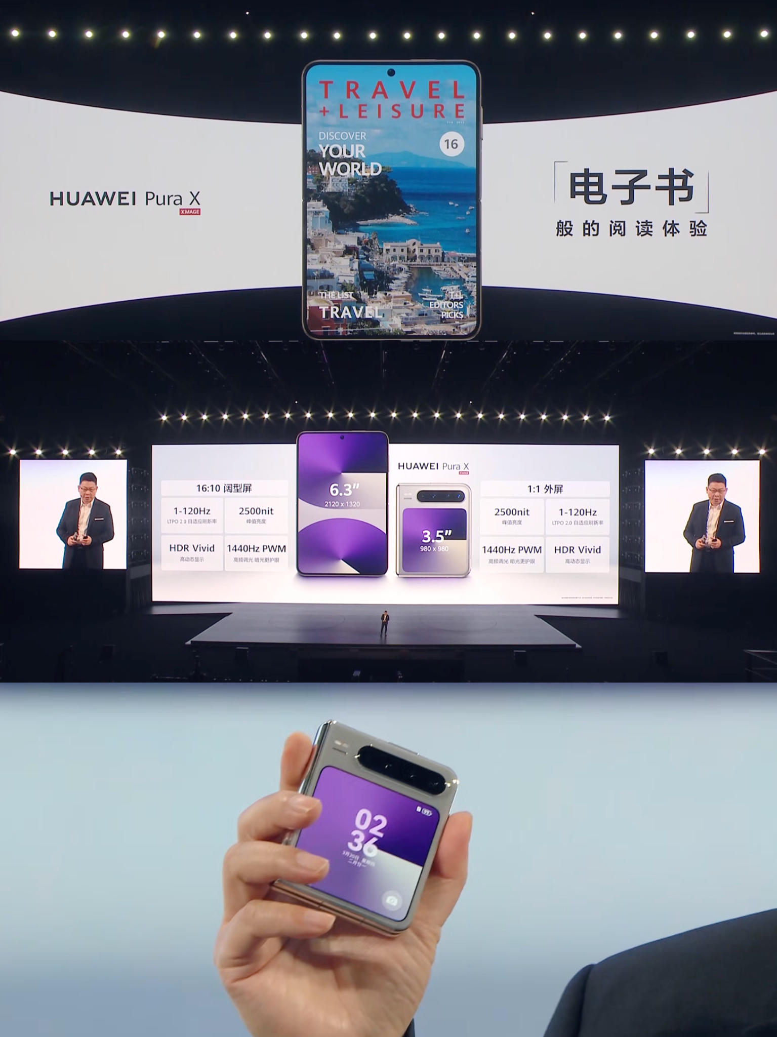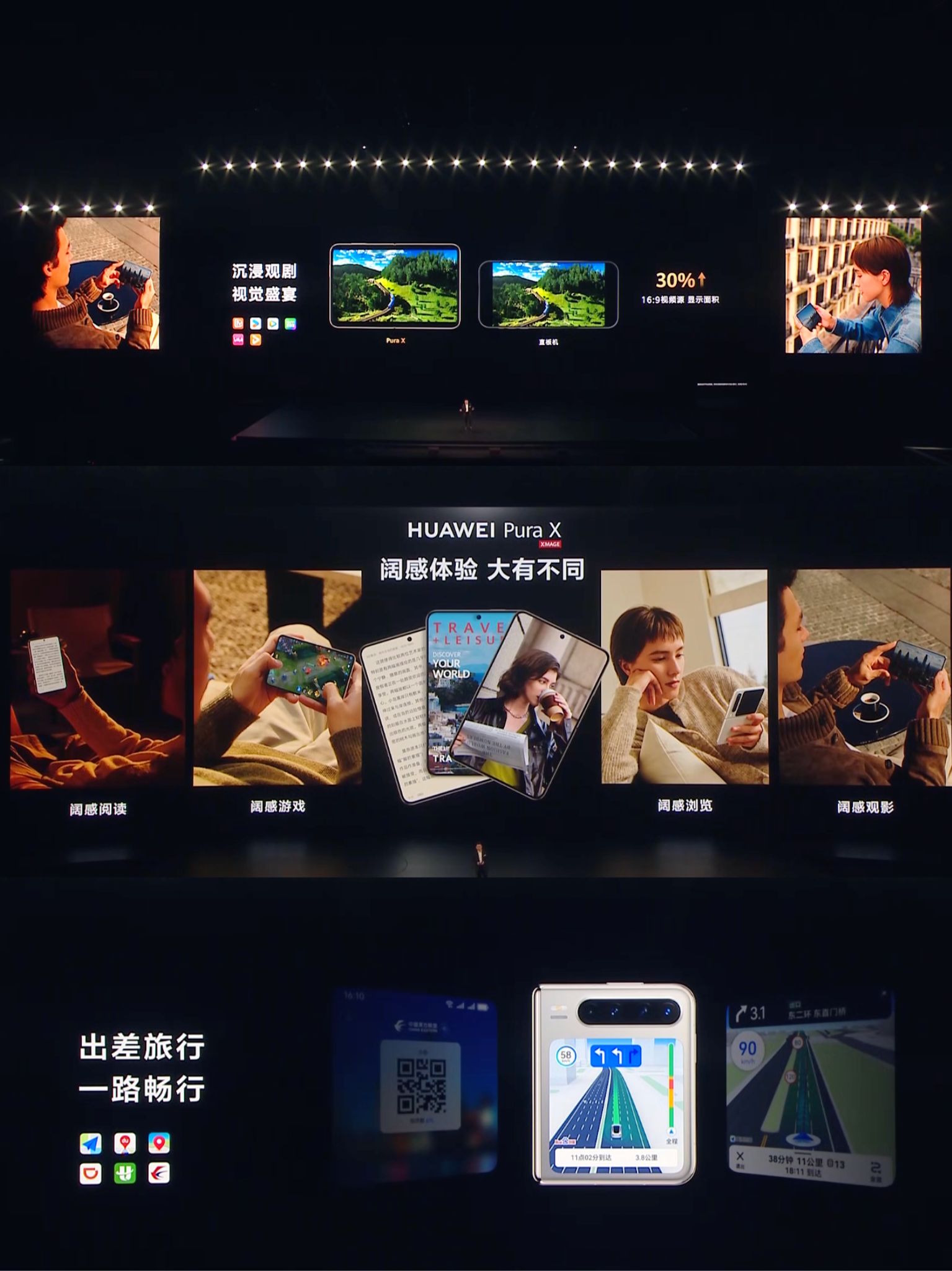 相较于直板机,Pura X 的内屏在观看 16:9 视频源的时候,显示面积增加了 30%;竖向阅读新闻和电子书的时候,图片显示面积提升了 60%。