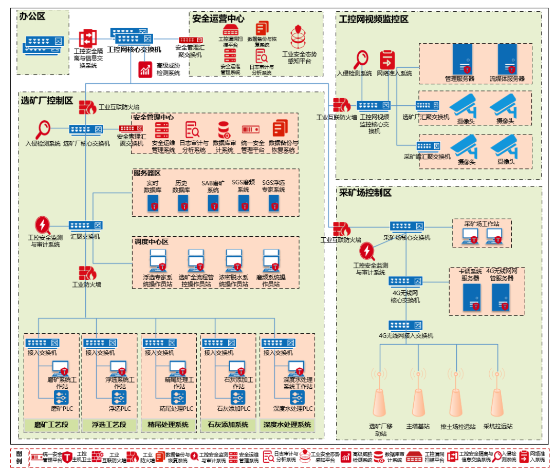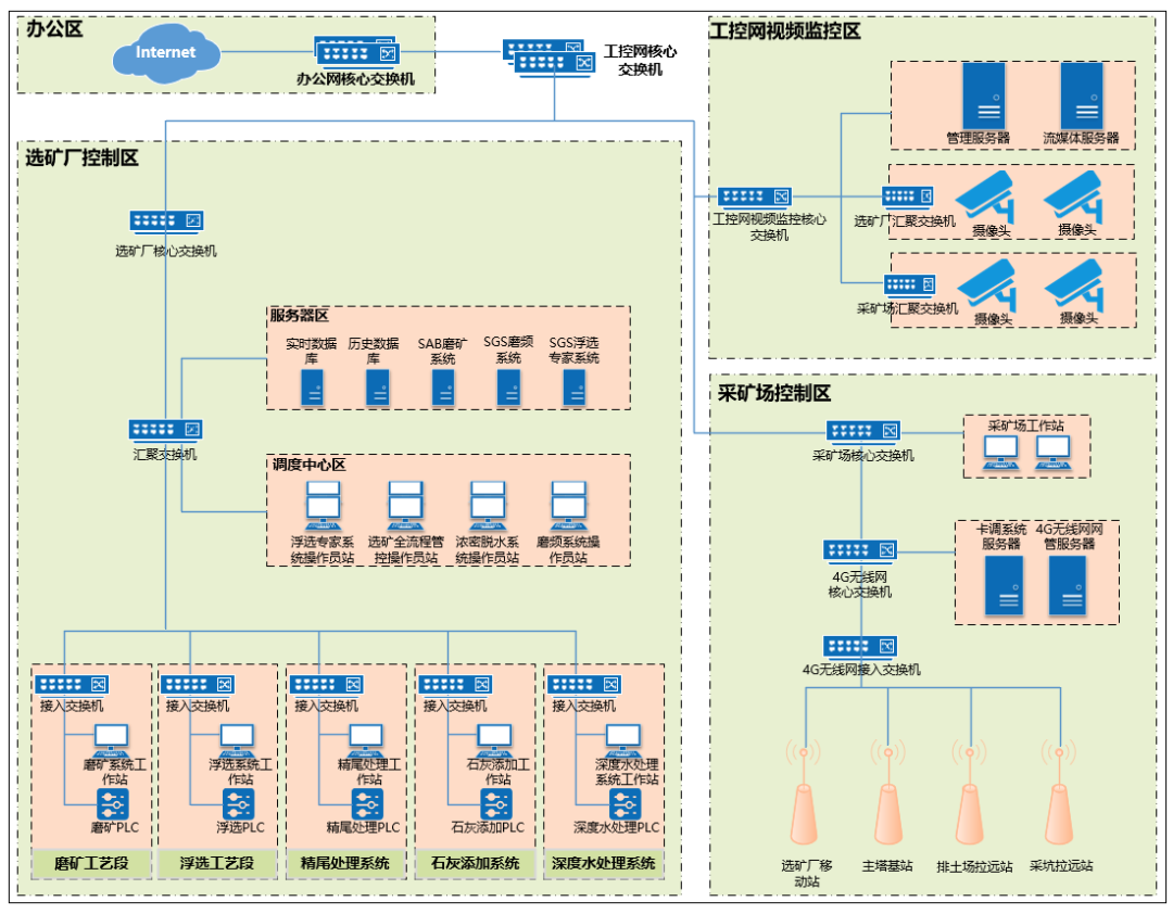铜矿工控网络区域主要可划分为选矿厂控制区、采矿场控制区和工控网视频监控区等区域: