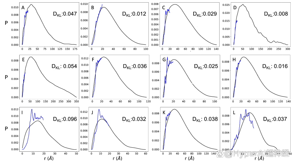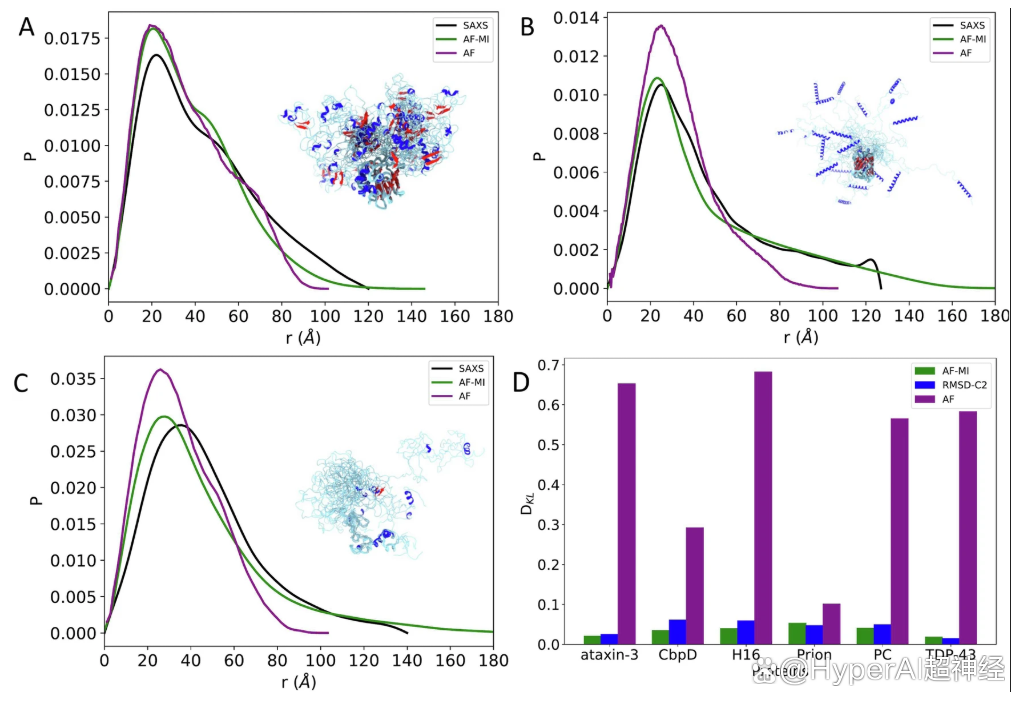 另外,研究人员还针对其他 3 种蛋白质 CbpD、H16 和 PC 进行了研究,结果表明,在所有情况下,实验和反向计算的残基间距离分布之间的一致性非常好,并且相对于直接从 AlphaFold 蛋白质结构数据库中获取的 AlphaFold 单个结构有很大的改善,如下图 D 所示。