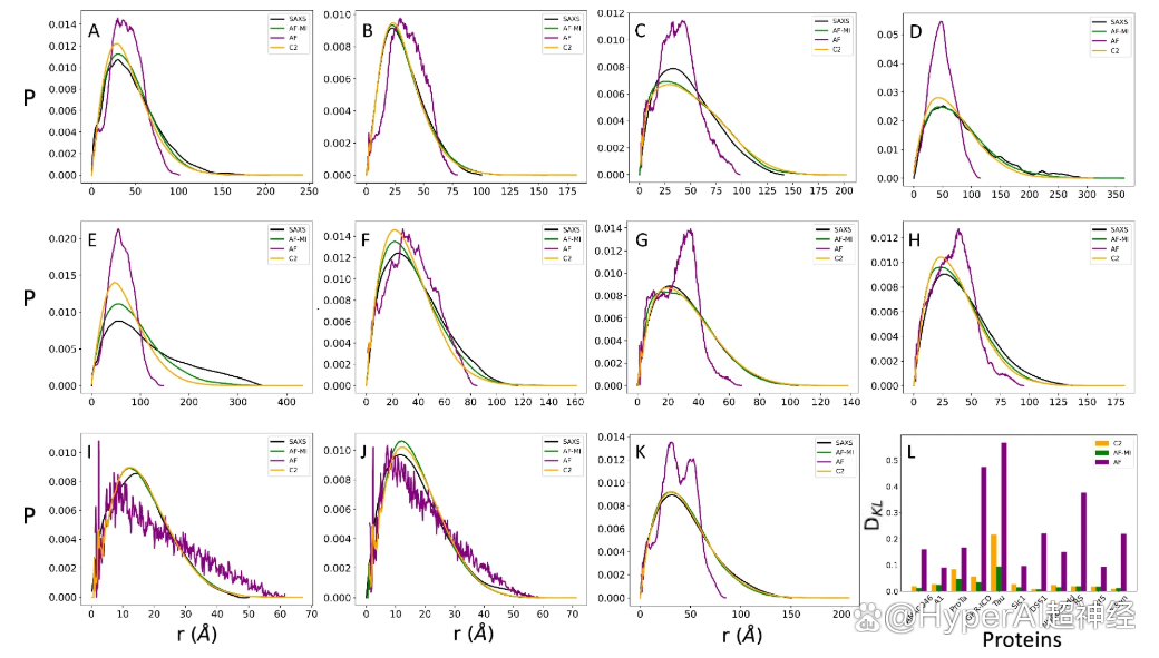 利用小角 X 射线散射测量可以计算出成对距离分布。研究人员比较了实验所得的距离分布与从 AlphaFold-Metainference 模拟确定的结构集合中获得距离分布,比较对象仍为上述所提到的 11 种高度无序蛋白质。