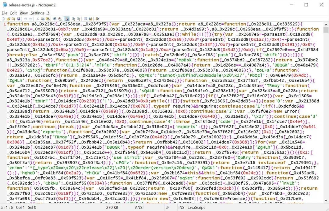 此外,他们解释说,主题应该是静态JSON文件,不执行任何代码,所以这种行为在他们的评估中被标记为可疑。此说法也得到了证实,主题中的“release-notes.js”文件包含严重混淆的JavaScript,这在开源软件中是一个危险信号。