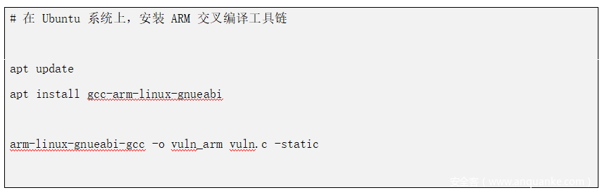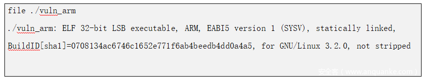编译完成后,得到一个 ARM 架构的二进制文件 vuln_arm。