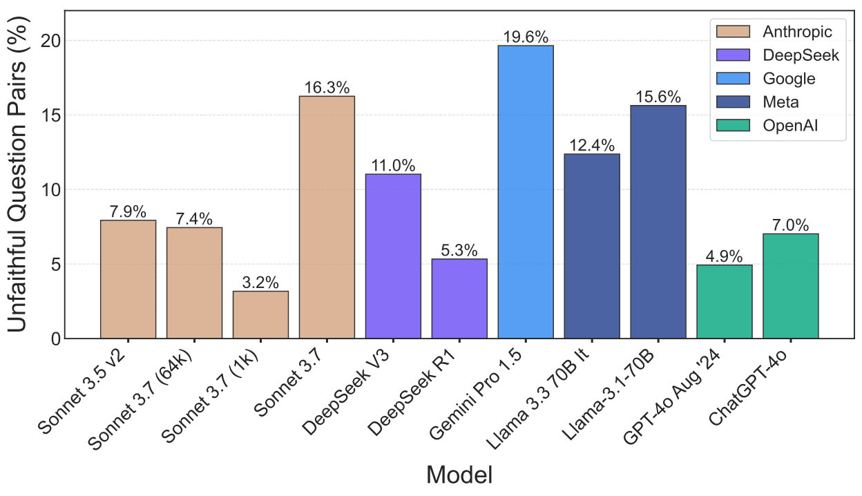 Chain-of-Thought Reasoning In The Wild Is Not Always Faithful [Buenos Aires, GDM] examine whether chain-of-thought reasoning in frontier models is faithful to their actual reasoning and their final response. They test both thinking and non-thinking models including Claude 3.7 Sonnet, DeepSeek R1, and ChatGPT-4o. The researchers identify three types of unfaithful reasoning: implicit post-hoc rationalization (where models justify biased answers without mentioning the bias), restoration errors (silently correcting mistakes), and unfaithful shortcuts (using illogical reasoning to simplify problems). On comparative questions, they find non-negligible unfaithfulness rates: 16.3% for Claude 3.7 Sonnet, 5.3% for DeepSeek R1, and 7.0% for ChatGPT-4o. Models often manipulate facts or switch arguments to maintain consistent but contradictory answers.