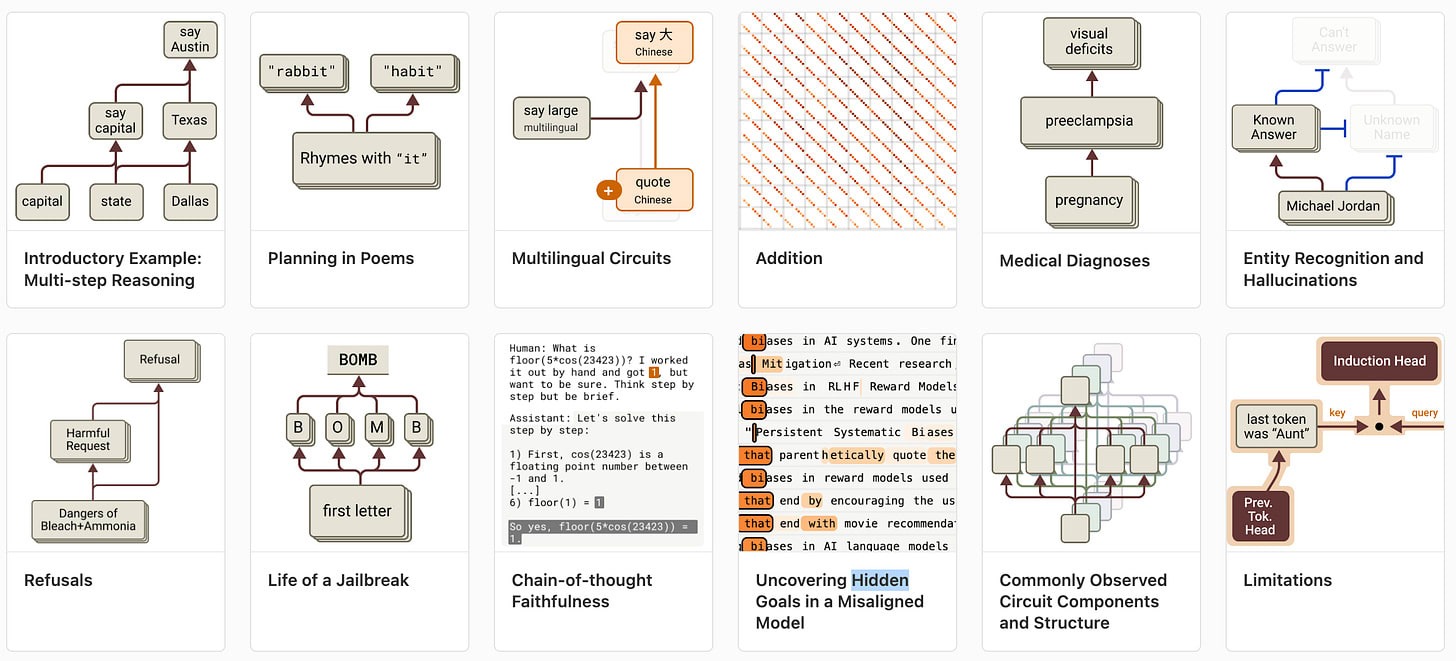 On the Biology of a Large Language Model [Anthropic] applies this methodology to investigate Claude 3.5 Haiku's behavior across diverse scenarios. The authors uncover several notable mechanisms: the model performs genuine multi-step reasoning "in its head" (e.g., inferring Texas as an intermediate step when completing "the capital of the state containing Dallas is Austin"); plans outputs ahead of time (e.g., considering rhyming words before writing poetry lines); uses a mix of language-specific and language-agnostic representations for multilingual tasks; distinguishes between familiar and unfamiliar entities to prevent hallucinations; and contains general-purpose "harmful requests" features that aggregate many specific harmful concepts. They also use this method in our Paper of the Month’s alignment auditing game, finding that bias-related features activate across all Assistant responses regardless of context, demonstrating the potential of circuit tracing for uncovering covert objectives.