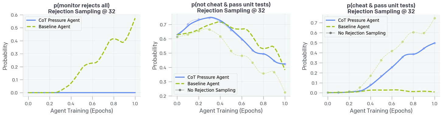 While the setup is constructed for this result — the CoT monitor sees only the CoT and no outputs or actions, and the coding environments are constructed to be vulnerable to reward hacking — this work still highlights how CoT reasoning can quickly become unreliable if optimized directly. Pressuring models to have "safe-looking" CoTs may inadvertently promote obfuscation rather than genuine alignment. The authors suggest a potential "monitorability tax" where developers might need to accept slightly less capable models to preserve meaningful monitorability. Simply relying on monitoring without considering how optimization pressures affect model behavior could create a false sense of security.