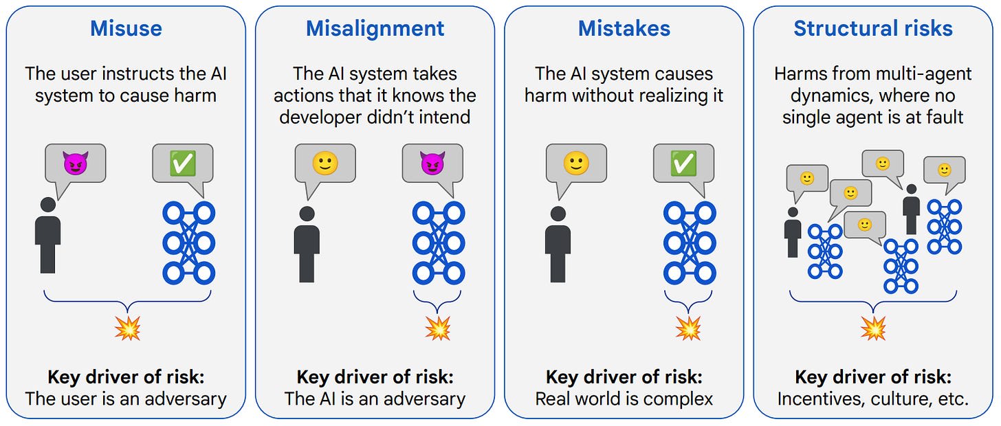 An Approach to Technical AGI Safety and Security [GDM] presents GDM’s strategy for addressing potential severe risks from artificial general intelligence (AGI). The authors focus on four risk areas—misuse, misalignment, mistakes, and structural risks—prioritizing solutions for the first two. For misuse, their approach centers on blocking bad actors' access to dangerous capabilities through model deployment mitigations, monitoring, access restrictions, and security measures. For misalignment, they propose a two-pronged strategy: first, developing "amplified oversight" to enable humans to supervise increasingly capable AI systems; second, implementing robust training and monitoring to prevent harm even from misaligned models. The paper acknowledges several core assumptions, including the continuation of current AI paradigms, no inherent ceiling to AI capabilities, uncertain development timelines, potential for accelerating improvement, and approximate continuity in capability development. They advocate for an "anytime" approach that can be implemented quickly if needed, while acknowledging the paper represents a roadmap rather than a complete solution, with many open research problems remaining.