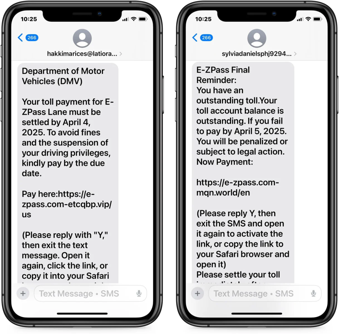近期,冒充 E-ZPass 及其他收费机构的网络钓鱼活动愈演愈烈,收件人会收到多条 iMessage 和短信,企图窃取个人及信用卡信息。