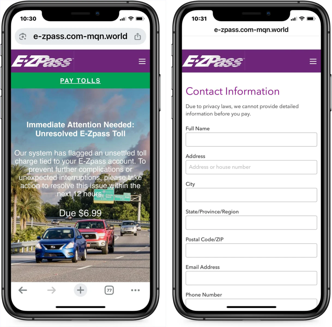 这些信息中嵌入了链接,一旦点击,就会将受害者带到冒充 E-ZPass、The Toll Roads、FasTrak 或其他收费机构的钓鱼网站,试图窃取他们的个人信息,包括姓名、电子邮件地址、实际地址和信用卡信息。