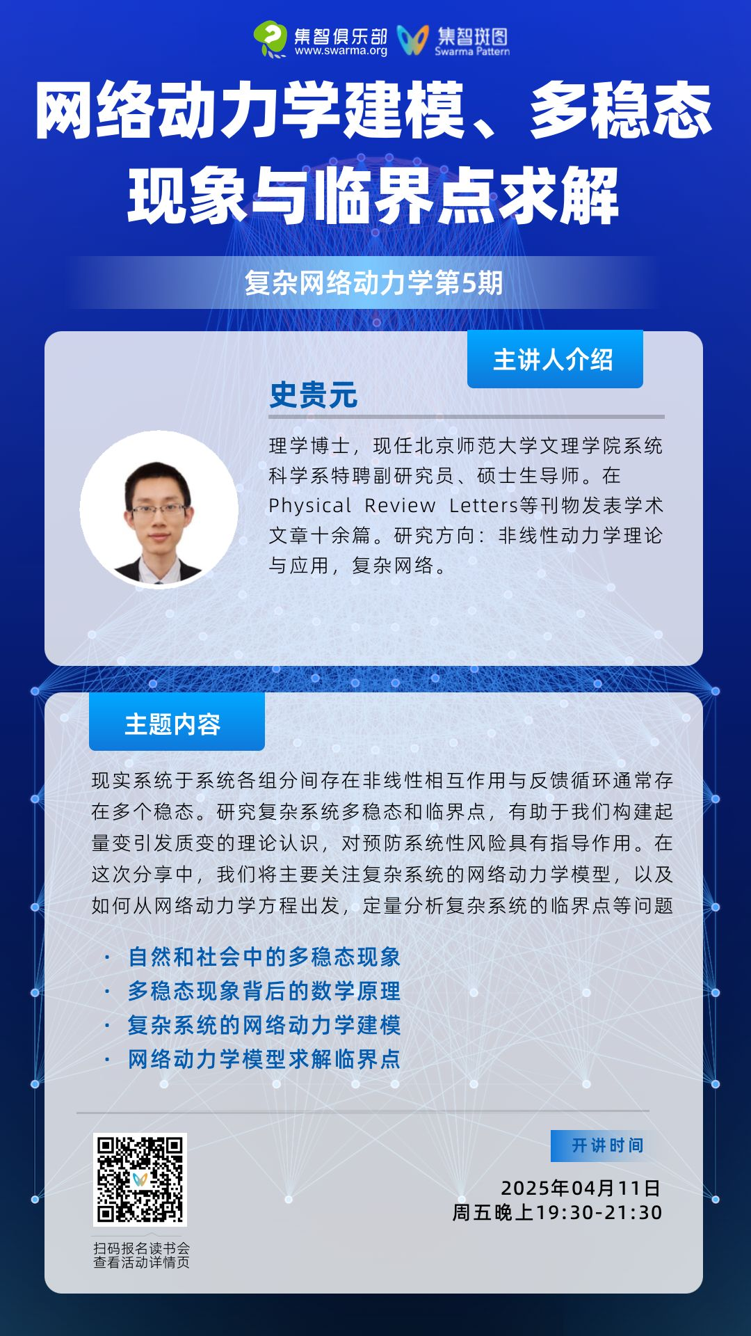「复杂网络动力学」读书会第五期将由北京师范大学文理学院系统科学系特聘副研究员史贵元老师分享,介绍如何构建网络动力学模型,定量分析复杂多稳态现象、解析临界点。读书会将于4月11日(本周五)19:30-21:30进行,欢迎感兴趣的朋友参与讨论交流!