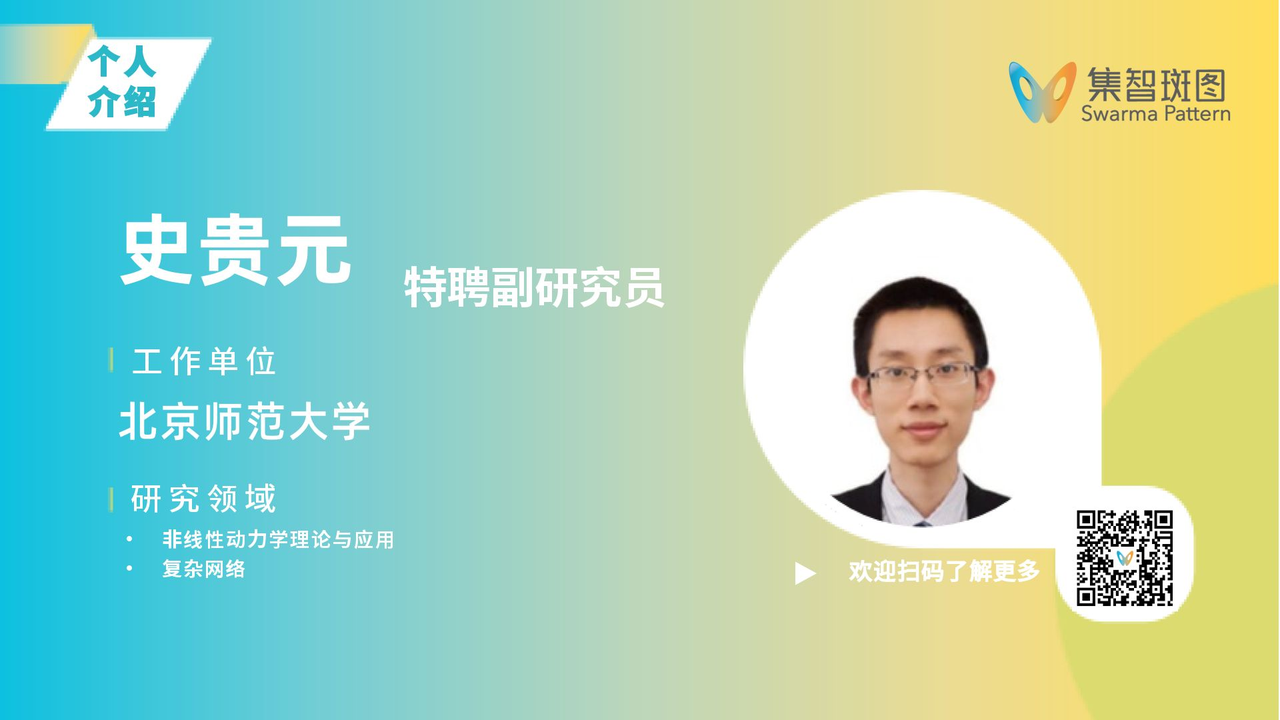 史贵元,理学博士,现任北京师范大学文理学院系统科学系特聘副研究员、硕士生导师。在Physical Review Letters等刊物发表学术文章十余篇。研究方向:非线性动力学理论与应用,复杂网络。