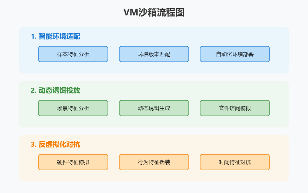 预分析完成后,高危样本会进入VM沙箱进行深度测试。与传统沙箱不同,我们的系统具备以下创新特点: