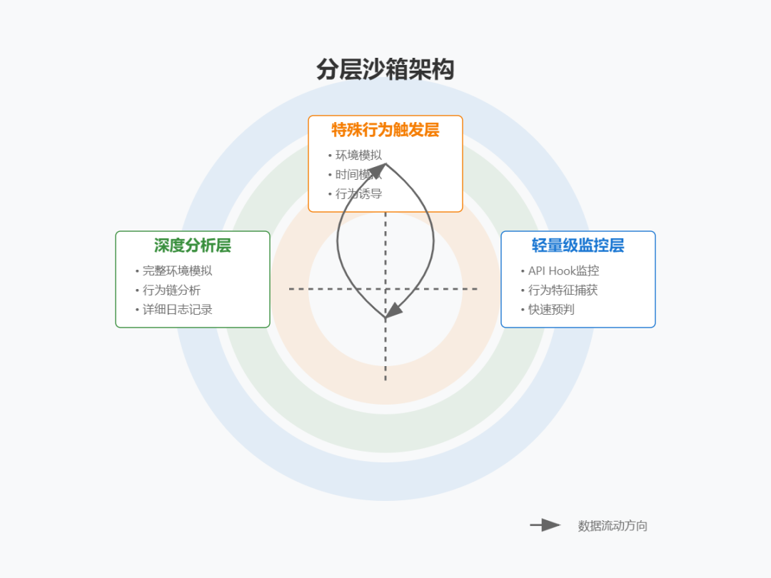 动态行为分析环节采用了创新的“分层沙箱”架构。第一层是轻量级行为监控,通过Hook关键API快速获取样本行为特征;第二层是深度行为分析,在隔离环境中完整模拟目标系统,记录详细的行为日志;第三层是特殊行为触发,通过环境模拟和时间模拟技术,诱导样本展现完整的恶意行为。