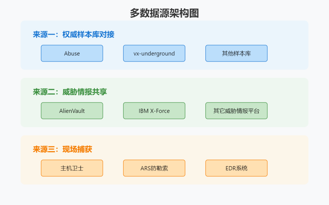 来源一是权威样本库对接。系统实时对接Abuse、vx-underground等全球知名的恶意代码平台,配置了智能的请求策略,确保在样本首次出现时就能第一时间获取。