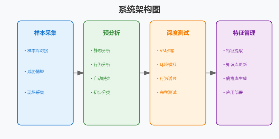 系统整体分为智能样本采集、云沙箱预分析、VM沙箱深度(精准)测试、特征库管理四个环节。