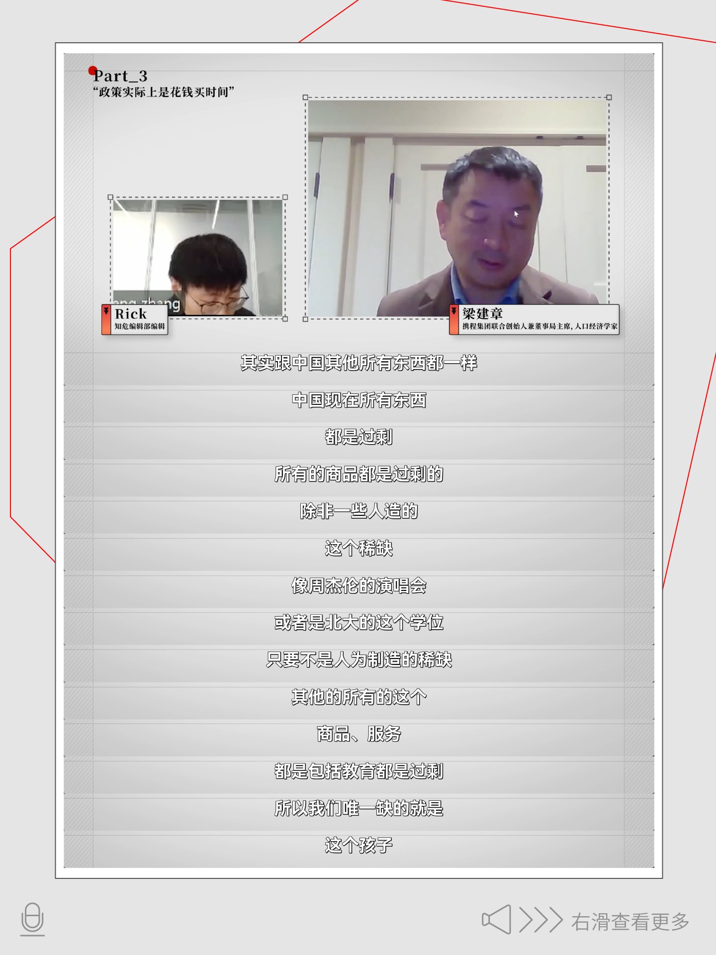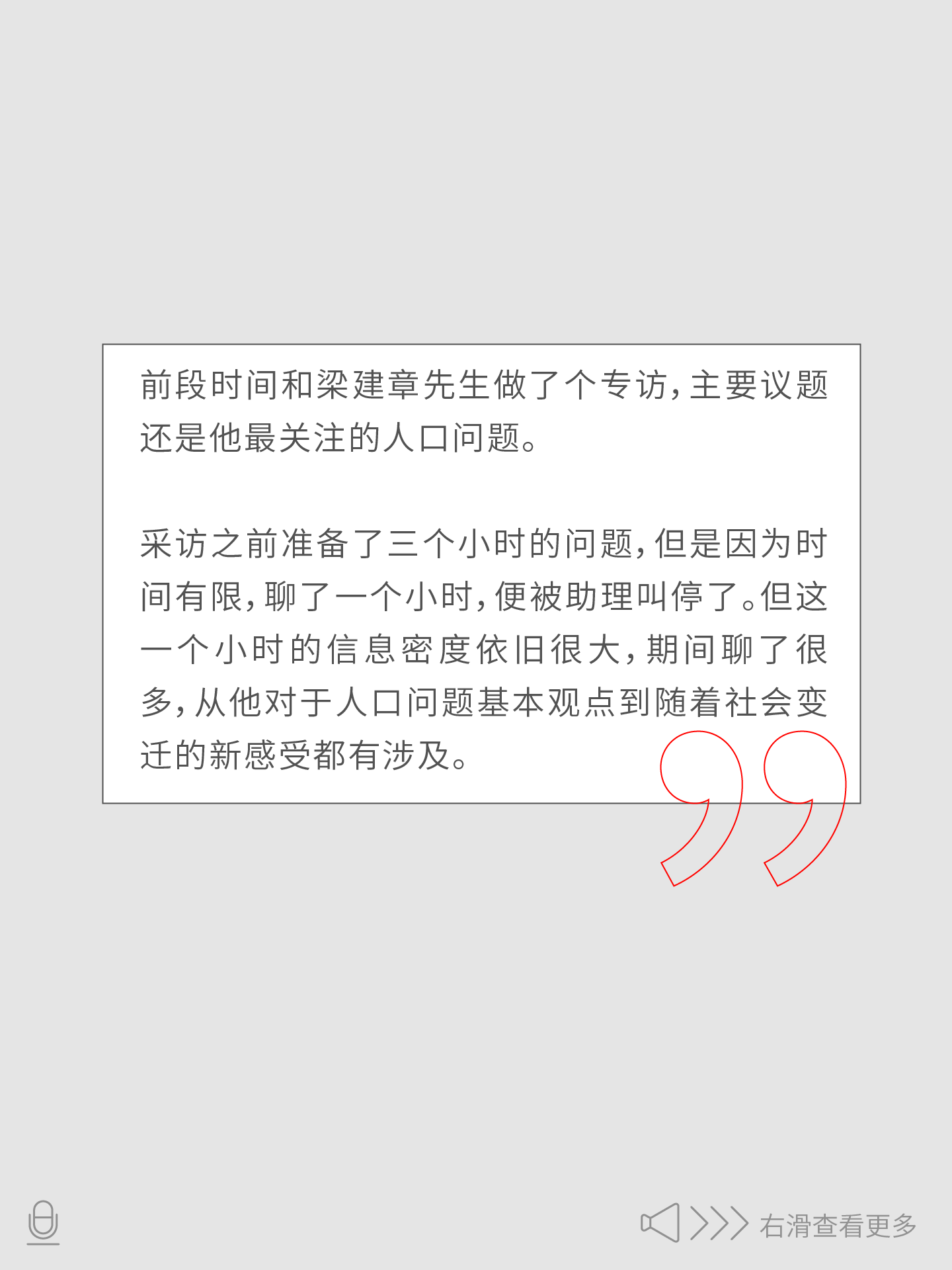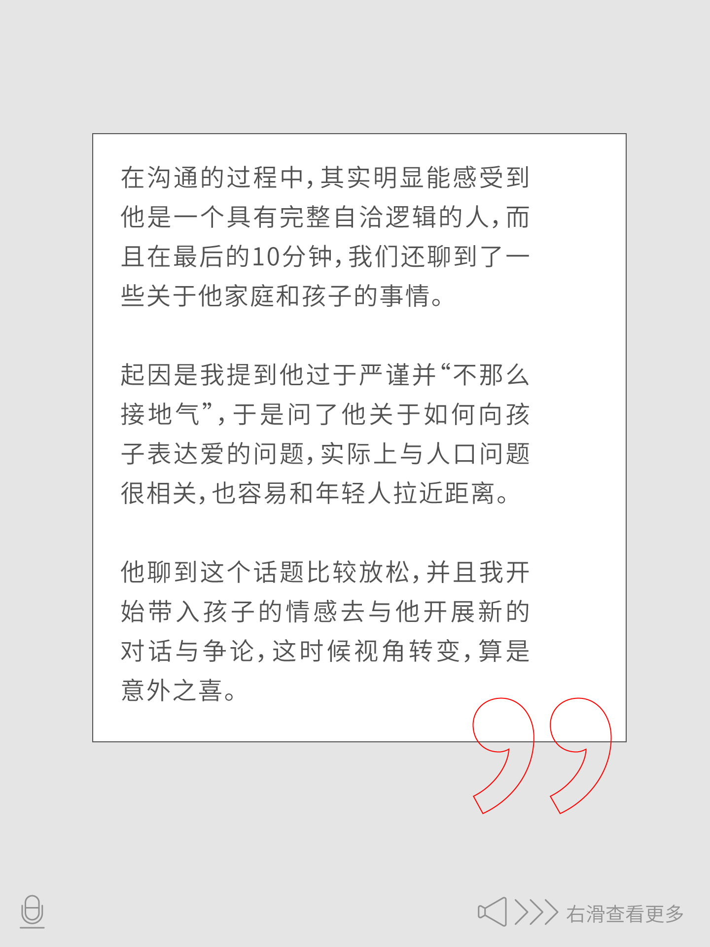 采访之前准备了三个小时的问题,但是因为时间有限,聊了一个小时,便被助理叫停了。但这一个小时的信息密度依旧很大,期间聊了很多,从他对于人口问题基本观点,到社会变迁的新感受都有涉及,也能感受到他是一个具有完整自洽逻辑的人。