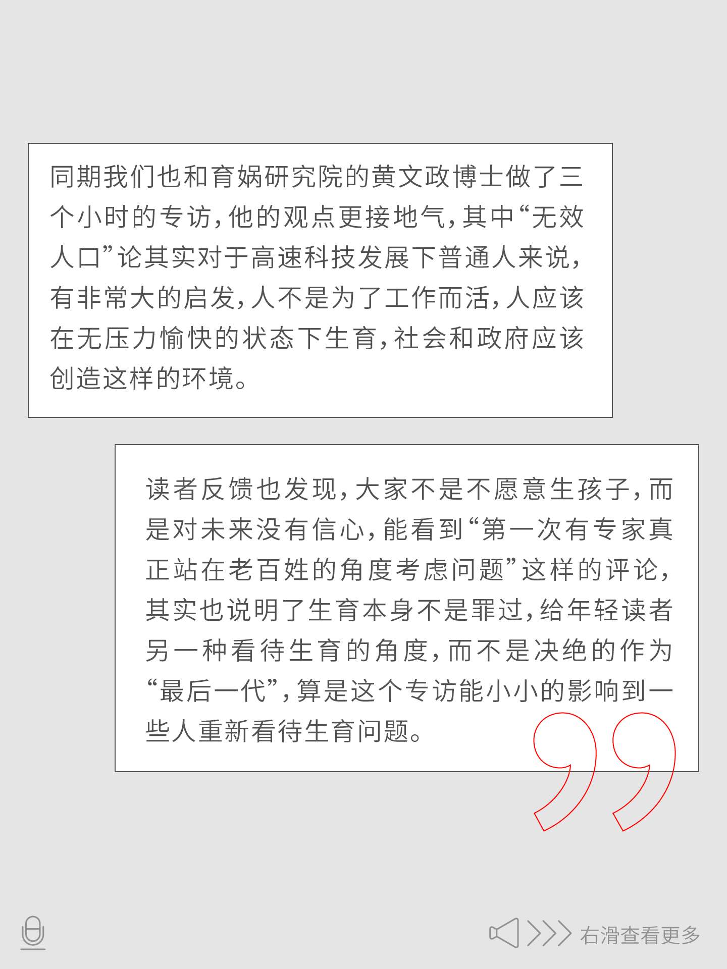 在读完各位的反馈后,我也发现,其实大家不是不愿意生孩子,而是对未来没有信心,能看到 “ 第一次有专家真正站在老百姓的角度考虑问题 ” 这样的评论,其实也说明了生育本身不是罪过,给年轻读者另一种看待生育的角度,给出了作为 “ 最后一代 ” 之外的另一种可能性,希望能帮助大家,更宏观地去看待生育的问题。