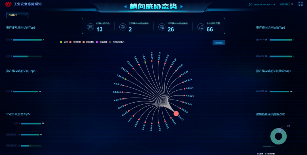 创新性地引入基于业务、基于工艺、基于拓扑的安全监测模式,以可视化拓扑方式实时展示网络安全问题。安全监测不再是安全设备本身的监测,而是基于网络内所有资产的监测,如主机、网络设备、服务器甚至“网线连通状态”,从单纯的安全监测提升到业务安全监测。