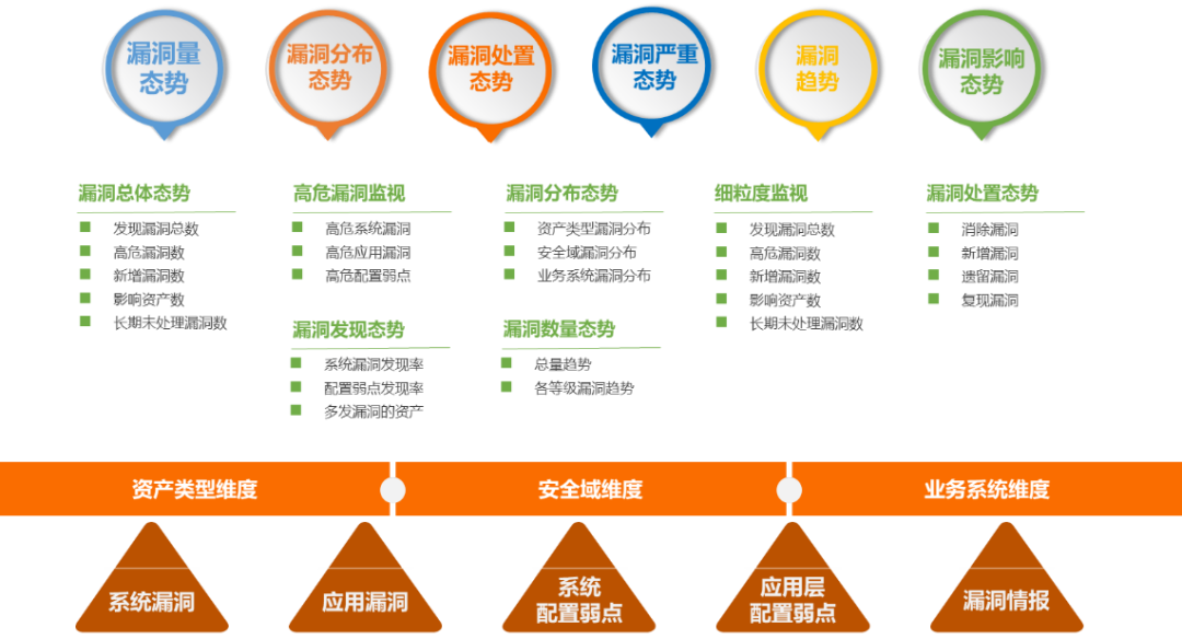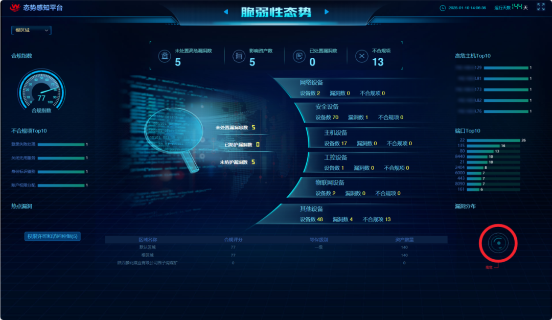 态势感知系统的漏洞感知可将内置的配置弱点扫描模块和网内所部署的工控系统无损漏扫整合,形成完整的漏洞弱点集中监测发现并统一呈现。基于所获取的各类系统漏洞、应用漏洞以及配置弱点信息进行漏洞隐患态势分析,包括与资产对象的关联、与业务系统的关联,并对脆弱性的分布、趋势、处置时间进行统计分析,隐患态势还可分析各漏洞以及配置弱点的成因,并通过资产感知所获取的资产指纹信息对网内各资产对象进行脆弱性发生隐患分析,支撑上层的脆弱性预警展示。