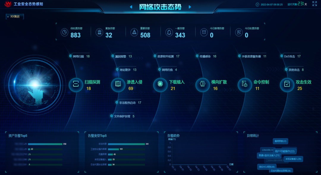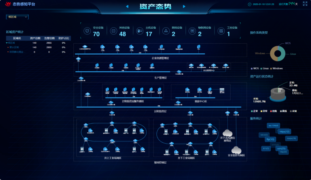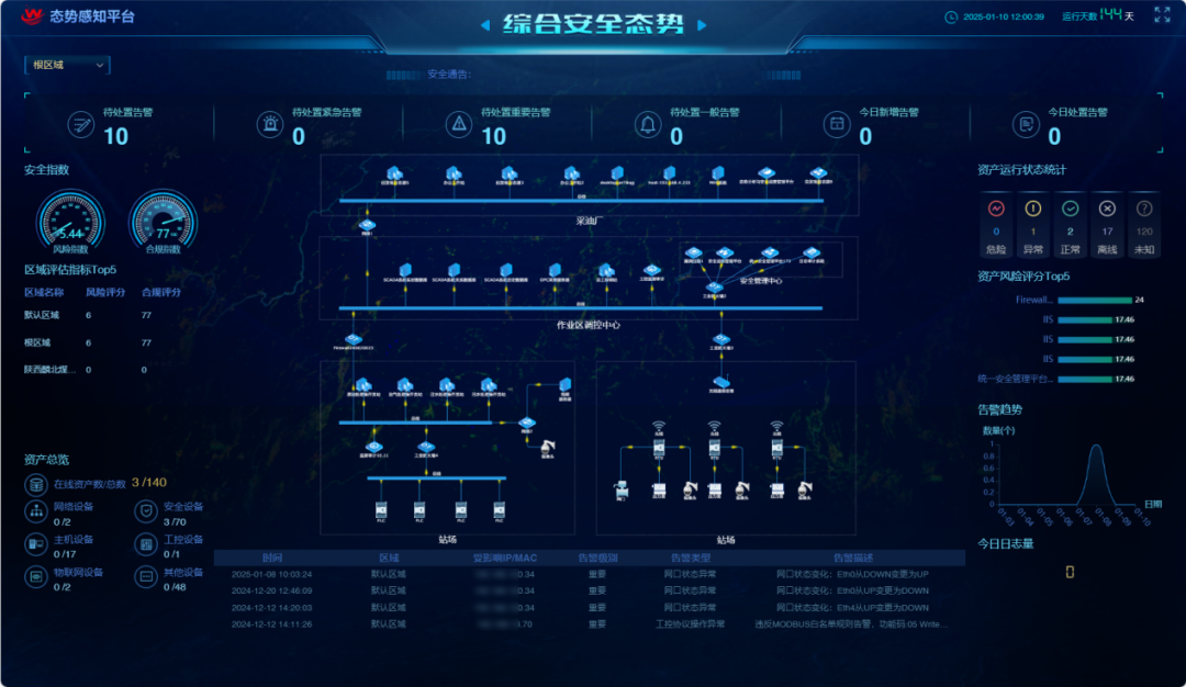 在此严峻形势下,构建全面、高效的工业安全态势感知体系迫在眉睫。企业亟需深入了解工业生产网络内部的资产详情、业务流量动态以及病毒木马等潜在威胁状况,通过在厂区全方位部署流量识别节点,并借助大数据分析技术对工业流量态势进行深度剖析,打造 “上下联动” 的态势感知网络架构,从而为工业控制系统的安全稳定运行保驾护航,确保企业在数字化转型的道路上稳健前行。