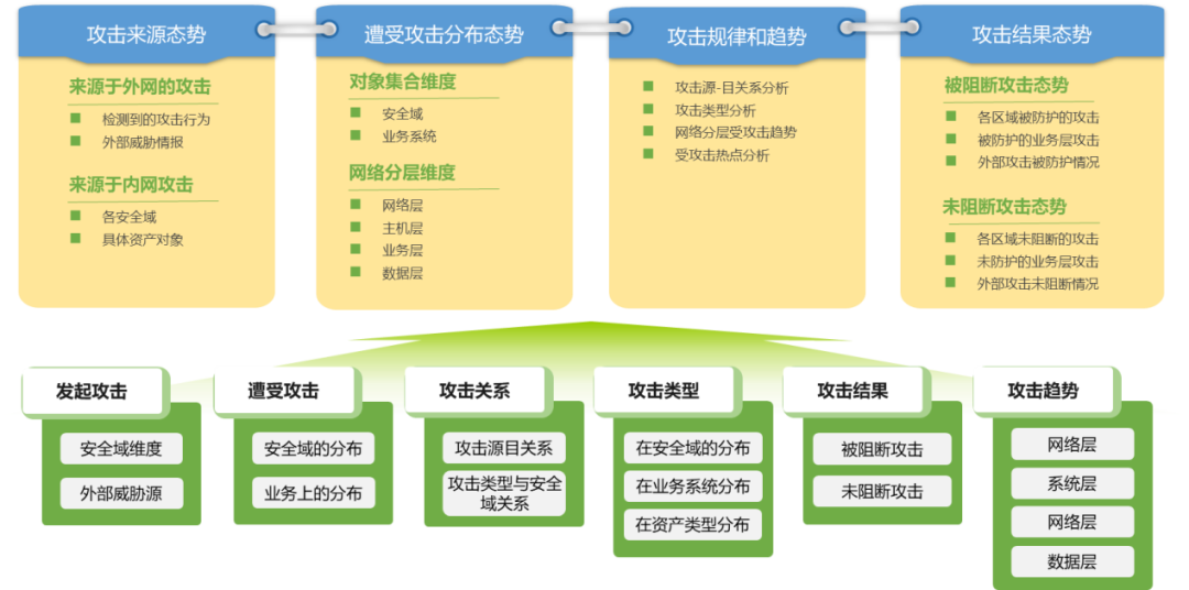 攻击态势根据态势的来源、分布、规律和趋势、攻击结果的维度去分析,形成最终的攻击全貌图,对攻击进行全面剖析,能够快速理解攻击的发起方、被攻击情况,攻击关系、类型、结果和趋势。