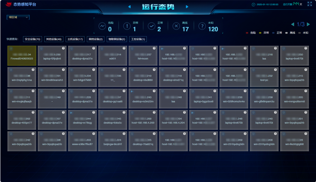 实时监测并展示系统内资产的可用性、运行情况、漏洞和告警情况。通过简单直观的颜色区别描述并展示系统资产的在线、离线、正常、异常、危险情况 ,该态势可反映系统整体运行情况。
