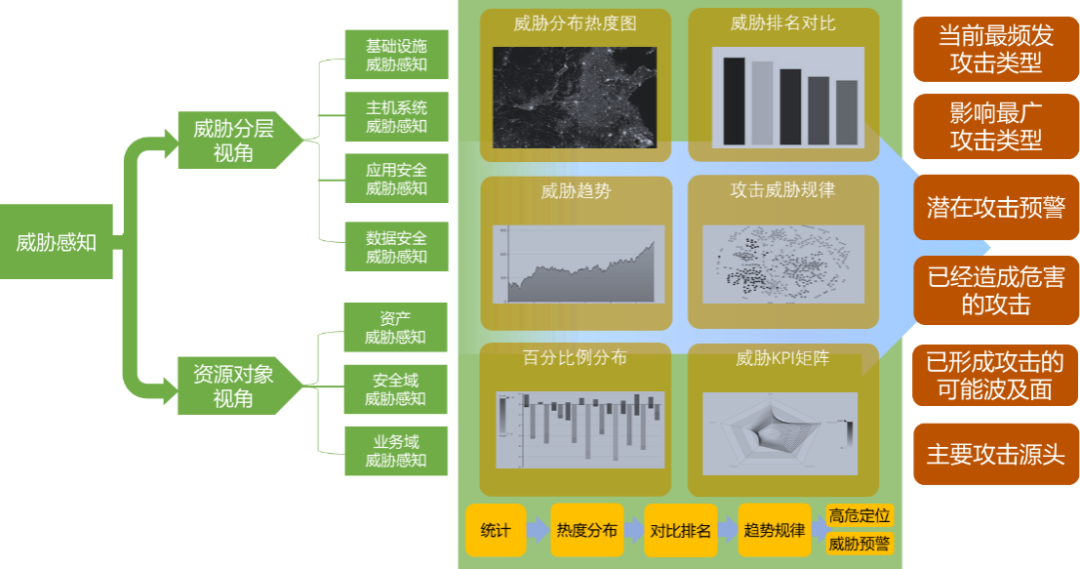 威胁感知实现对攻击行为和入侵监测的威胁隐患的整体态势感知。通过威胁信息的目标维度、攻击类型、业务关联维度、时间维度、与脆弱性信息的关联维度等等进行数据处理,通过威胁感知的可视化呈现使用户对全网的威胁入侵态势整体把控,并通过威胁事件关联分析、漏洞关联分析、KPI威胁模型、自学习异常分析等方式发现潜在威胁,进行威胁感知预警。