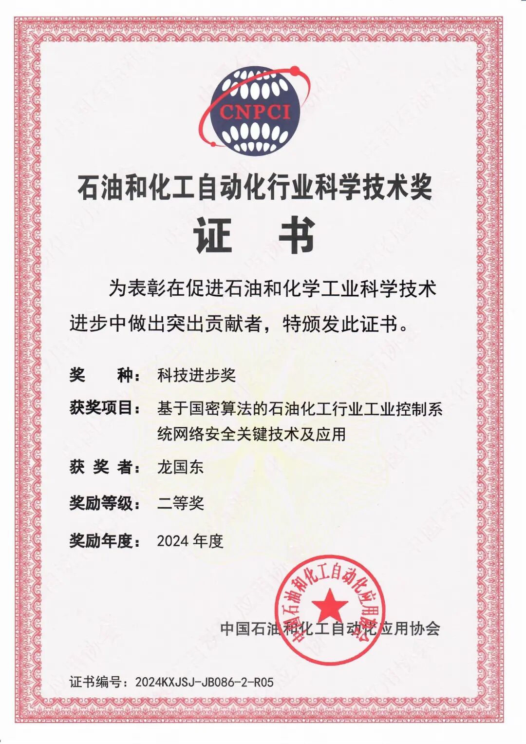 近日,中国石油和化工自动化应用协会在浙江省杭州市组织召开“2025年度中国石油和化学工业智能化发展大会”,并同步举办“2024年度中国石油和化工自动化行业科学技术奖与专利奖颁奖大会”。大会隆重表彰2024年度中国石油和化工自动化行业科学技术奖获奖单位和获奖者,并举行颁奖仪式。威努特联合申报的“基于国密算法的石油化工行业工业控制系统网络安全关键技术及应用”项目,凭借卓越的技术创新和突出的应用前景,被授予2024年度石油和化工自动化行业科学技术奖—科技进步奖二等奖。