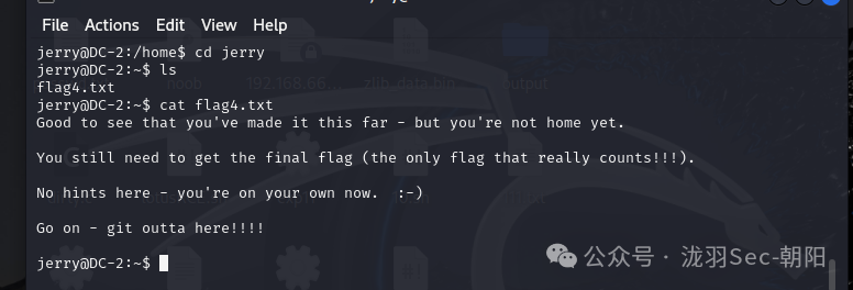 这里我们使用su jerry就能进入到jerry用户,这里tom写的环境变量需要等一等才能生效,在我这里如果执行了环境变量直接到jerry用户会报错。然后我们进入到jerry目录就能发现了flag4