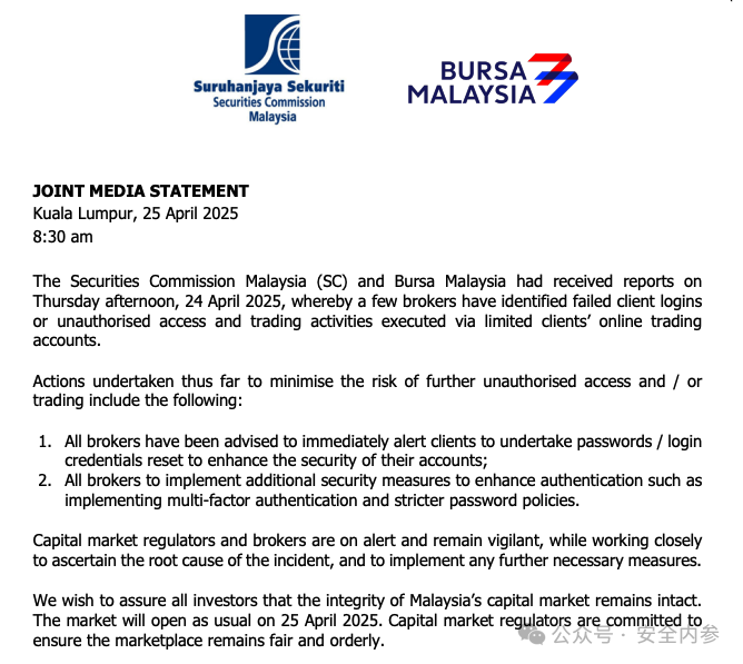 马来西亚交易所披露,收到多家券商上报,部分用户交易账户出现未授权访问与交易活动。