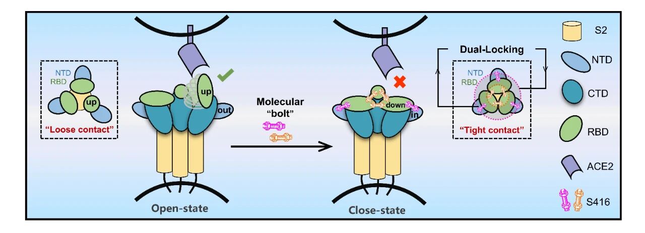 研究团队成功解析并验证了新型两亲性小分子S416的抗病毒机制——这种仿生设计的智能“分子螺栓”通过协同结合刺突蛋白三聚体界面的两个变构位点发挥双重锁扣效应,将新冠病毒S蛋白强力锚定于非活化的关闭构象,形成受体结合域'全封闭锁'。冷冻电镜与分子动力学模拟证实,该化合物可完全阻断S蛋白与ACE2受体的互作界面,作用位点在SARS-CoV、MERS-CoV等β冠状病毒中高度保守,为开发克服病毒逃逸的广谱抗冠状病毒药物提供了一种全新的技术路径。新冠病毒表面的刺突蛋白是病毒入侵宿主细胞的关键武器。它像一把钥匙,需要从“关闭”(down)构象转变为“开放”(up)构象,才能结合人体细胞表面的ACE2受体,介导病毒进入细胞。阻止刺突蛋白的这种构象变化,将其稳定在“关闭”状态,是开发抗新冠药物的重要策略。然而,刺突蛋白的高度动态性和易突变性给药物设计带来了巨大挑战。该研究发现: