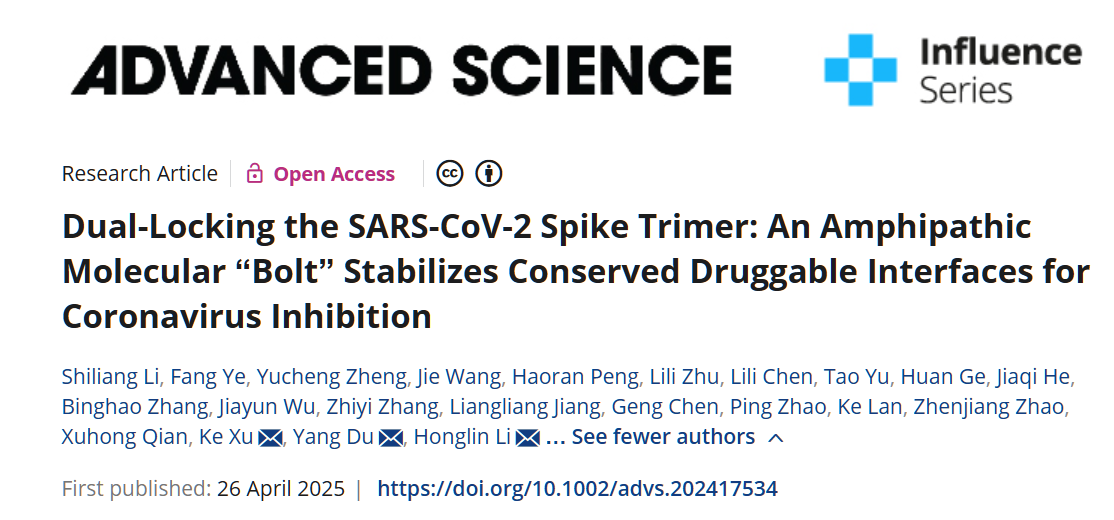 华东师范大学药学院/人工智能新药创智中心李洪林/李诗良教授团队、香港中文大学(深圳)医学院杜洋研究员团队、武汉大学徐可教授团队联合海军军医大学等于2025年4月26日在国际学术期刊Advanced Science发表题为“Dual-Locking the SARS-CoV-2 Spike Trimer: An Amphipathic Molecular “Bolt” Stabilizes Conserved Druggable Interfaces for Coronavirus Inhibition”的研究论文。