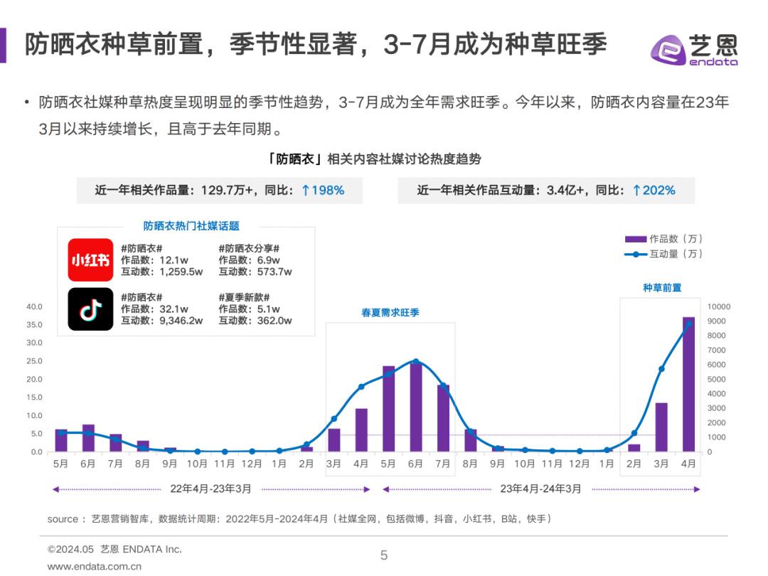 据艺恩数据显示,当前防晒衣仍然是消费者最主流的防晒服饰产品,防晒衣在夏季的讨论度十分之高,季节性显著。