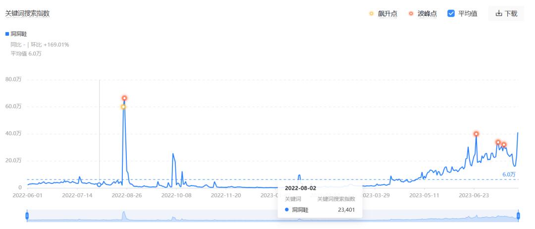 2023年,洞洞鞋可以说是当之无愧的明星单品。2024年,其火热程度依旧。据巨量数据显示,当前洞洞鞋热度对比去年不降反增,热度持续走高。