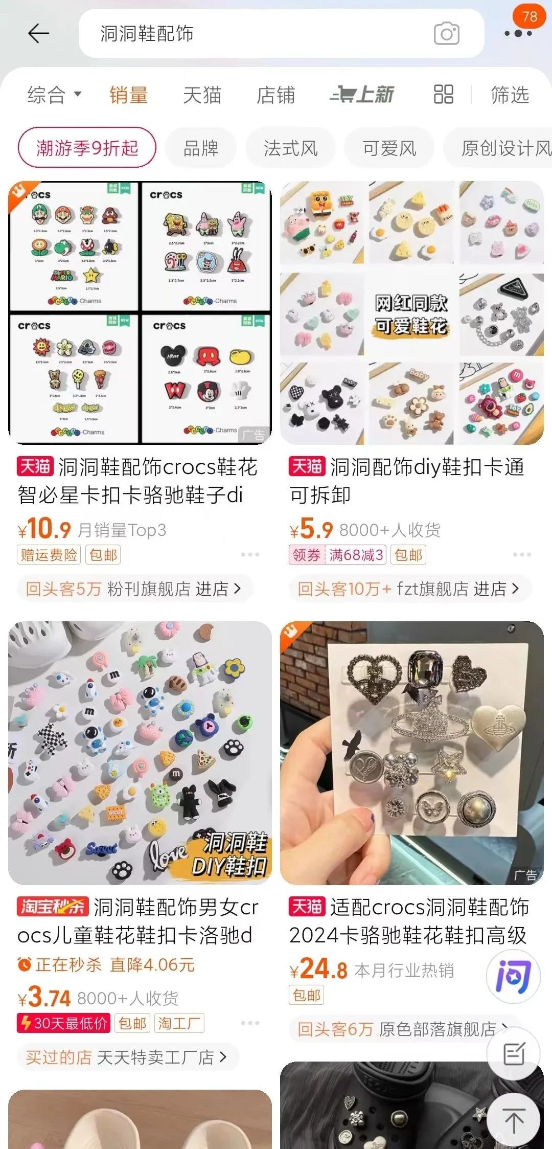 除了自身的舒适、方便外,洞洞鞋的洞洞配饰也同步走红。小红书上,相关穿搭内容繁多。淘宝上,出现了相关商家,只卖洞洞鞋配饰,价格从一元到几十元不等,款式多样。