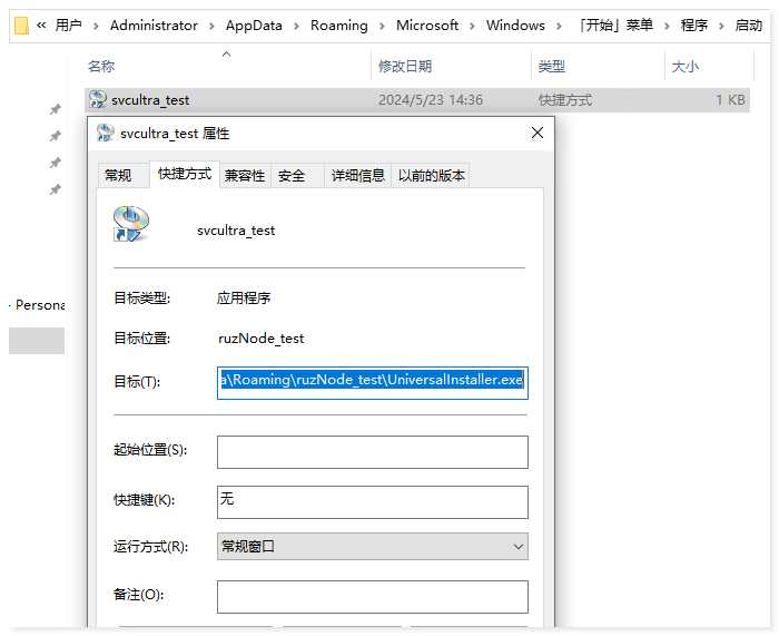 在解密完成后,还会释放 svcultra_test 到开机启动项目录中,指向 "C:\Users\Administrator\AppData\Roaming\ruzNode_test\UniversalInstaller.exe" 执行持久化操作: