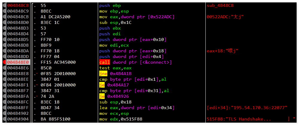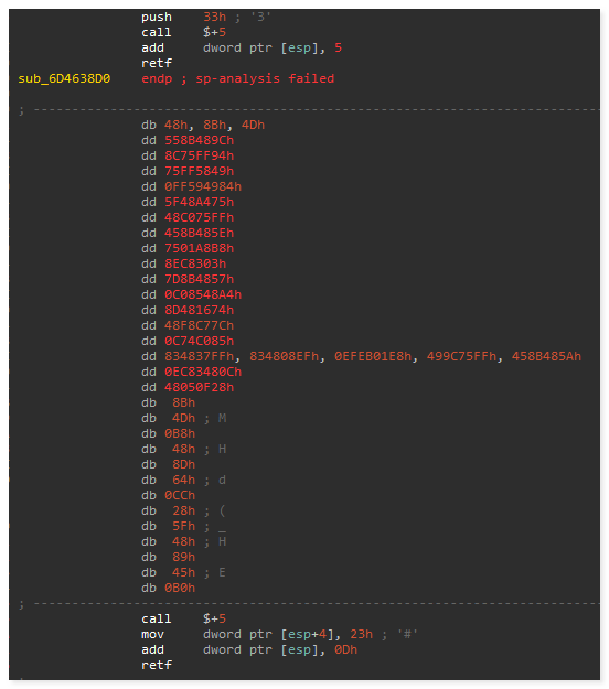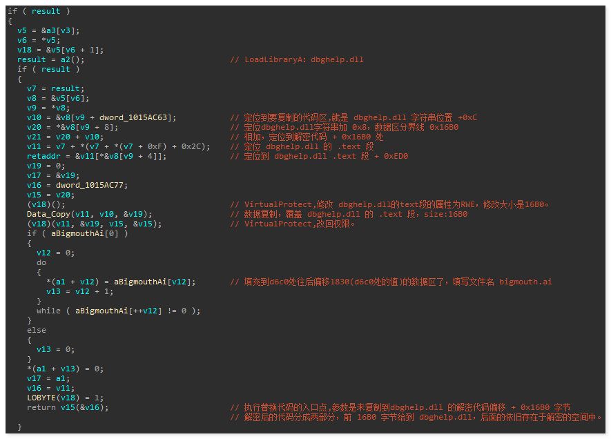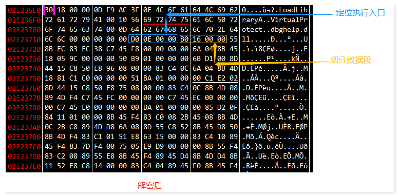 解密后的字节码有很多都是用于标记位置的“偏移值”,在加载 dbghelp.dll 后,会先获取用于定位注入 dbghelp.dll 位置的偏移写入解密代码,再根据“划分数据段的”的偏移限制注入大小,以此“分段”执行——即执行代码位于 dbghelp.dll 中,但相关数据依旧存在于解密空间中: