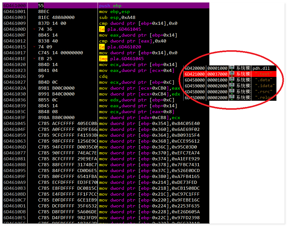同样的读取解密代码前面的字符串数据继续执行下一步注入,这里定位解密代码入口点并替换到加载的 pla.dll 的入口点处: