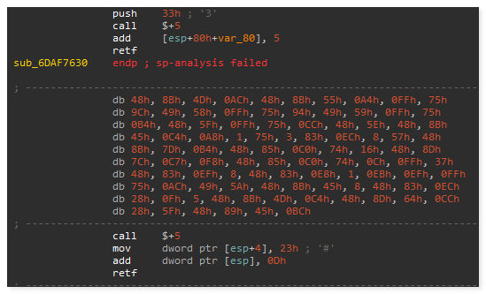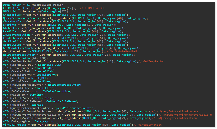 Dump 出解密代码进行分析,其先动态获取所需函数,执行相关初始化操作: