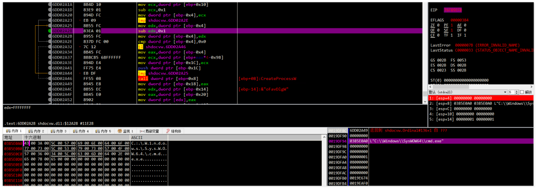 新启动的 C:\Users\Administrator\AppData\Roaming\ruzNode_test\UniversalInstaller.exe 会重复上述解密流程,随后继续以类似的逻辑将分段代码注入到 shdocvw.dll 中(这里不再细究),并在该区段内调用 CreateProcessW 函数创建 "C:\Windows\SysWOW64\cmd.exe" 进程用于注入第三阶段 shellcode: