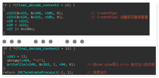 其中,与 "C:\Windows\SysWOW64\cmd.exe" 的通信是通过管道进行的,最后会通过管道向 "C:\Windows\SysWOW64\cmd.exe" 写入"\r\n" 使其执行注入的 shellcode: