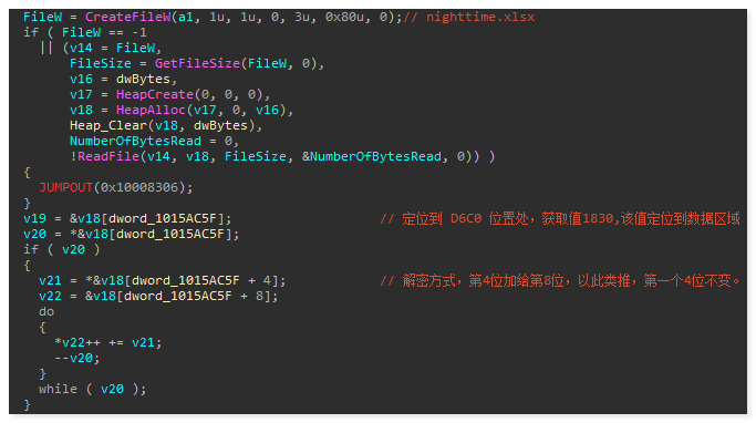 relay.dll 的 DllMain 函数会加载同目录下的 nighttime.xlsx 文件并进行解密,先是定位到固定的 D6C0 位置处,获取文件数据区的正向偏移后开始解密 D6C0 处的内容,解密方式是从第 4 位偏移开始,以 DWORD 为单位向前递加,具体细节如下所示: