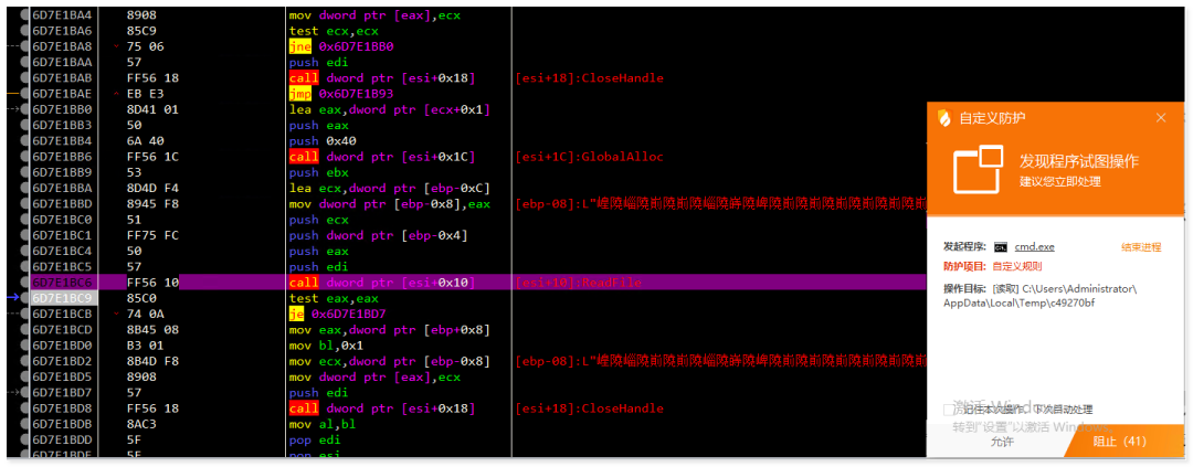 第二阶段的代码在成功注入 "C:\Windows\SysWOW64\cmd.exe" 后会在 "C:\Users\Administrator\AppData\Local\Temp" 目录下释放加密的字节码文件,被注入的 "C:\Windows\SysWOW64\cmd.exe" 在执行过程中会读取该文件的内容并进行解密: