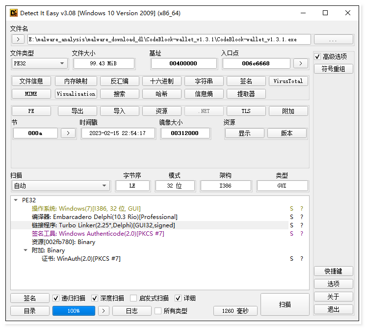 "CodeBlock-wallet_v1.3.1.exe" 由 Embarcardero Delphi 编译,是 Inno Setup 的引导程序,其会加载同目录下的 CodeBlock-wallet_v1.3.1-0.bin 进行第二阶段 Payload 文件的释放: