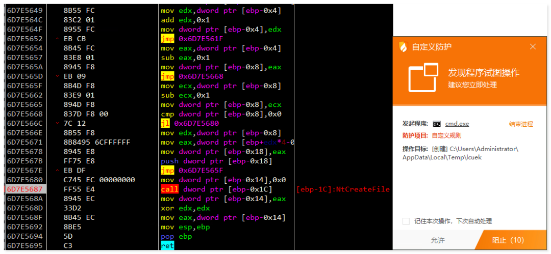 接着调用 Ntdll!NtCreateFile 在同样是 "C:\Users\Administrator\AppData\Local\Temp" 的目录下创建相应文件准备写入解密内容: