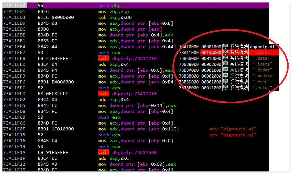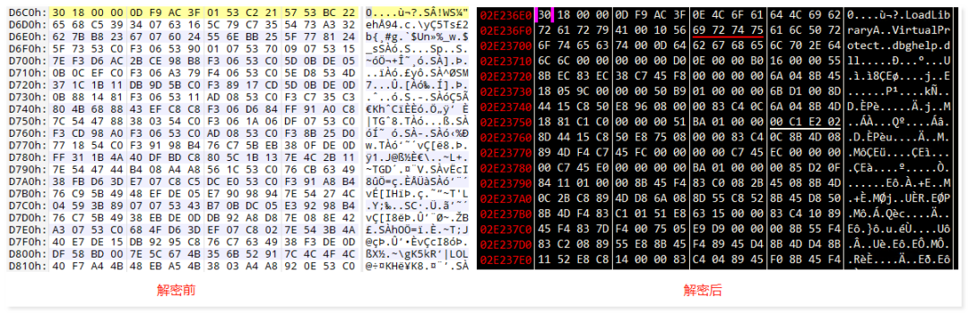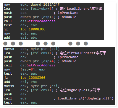 解密后的内容中,前面是需要调用的字符串,relay.dll 会分别定位解密数据前面的 3 个字符串 LoadLibraryA、VirtualProtect、dbghelp.dll,获取其函数地址并进行调用,然后加载 dbghelp.dll 进内存空间准备执行后续注入操作: