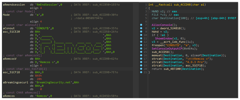 用于注入 "C:\Windows\SysWOW64\explorer.exe" 进程的 EXE 实际上是一个 Remcos 远控后门,属于 4.9.3 的专业版:
