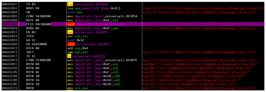 在前面释放的文件中 UIxMarketPlugin.dll 并没有被加载执行,UniversalInstaller.exe 直接通过 LoadLibraryW 加载同目录下 relay.dll ,调用其 DllMain 函数执行后续主要操作: