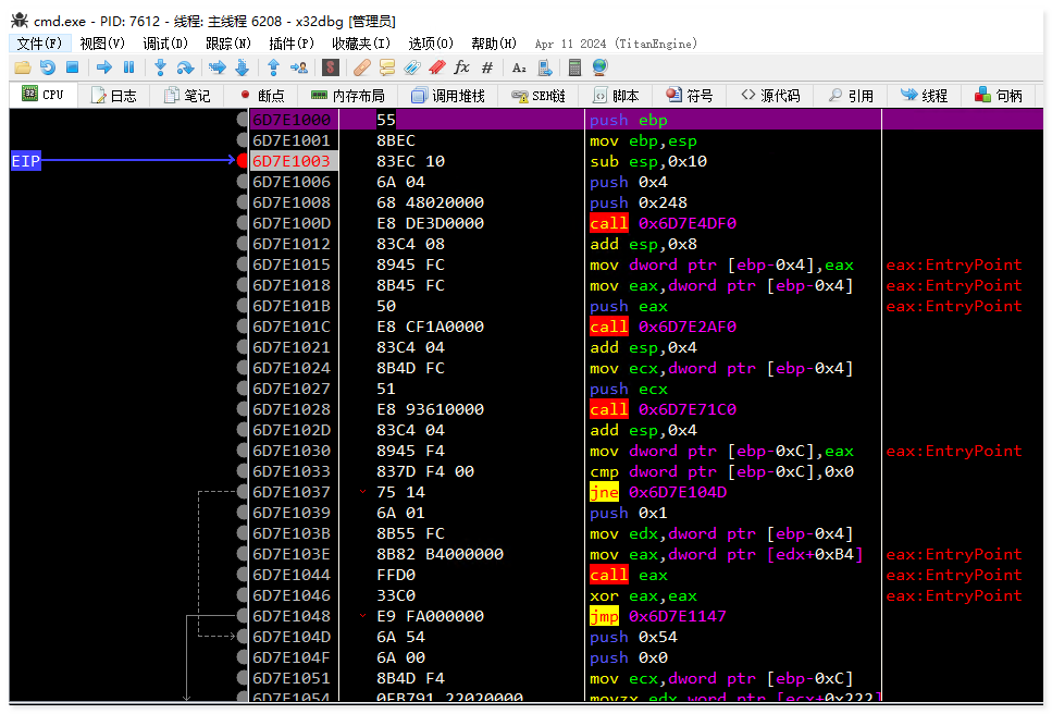 通过天堂之门调用 Ntdll!NtCreateThreadEx、Ntdll!NtWriteVirtualMemory 等 API,将下一阶段 shellcode 以远程线程注入到 "C:\Windows\SysWOW64\cmd.exe" 中——先是将完整的 pla.dll 写入 cmd 的内存空间中,随后再将解密的代码注入到 pla.dll 的 .text 段入口点,最后调用 Ntdll!NtResumeThread 恢复线程: